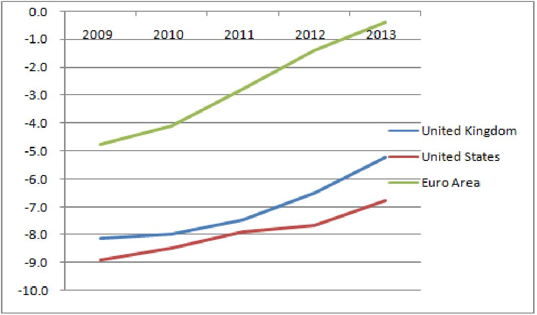 There has been a little discussion of why the UK ‘recovery’ has been poorer than in the US following Adam Posen’s speech (a quick summary of which is here). Adam Posen makes a number of interesting points, particularly regarding bank credit. However some of the discussion has focused on fiscal policy: is greater austerity in the UK part of the explanation? In an earlier post I compared the degree of austerity in the US, UK and Euro area using OECD data, but only by comparing forecasts for 2013 with 2010 outturns. Here is a bit more detail.