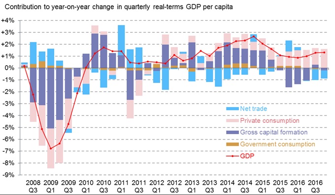 When the Bank of England after the Brexit vote forecast 0.8% GDP growth in 2017, they expected consumption growth to decline to just 1%, with only a small fall in the savings ratio. But consumption growth proved much stronger in the second half of 2016 than the Bank had expected. As this chart from the Resolution Foundation shows, pretty well all the GDP growth through 2016 was down to consumption growth, something they rightly describe as unsustainable. (If consumption is growing but the other components of GDP are not, that implies consumers are eating into their savings. That cannot go on forever)